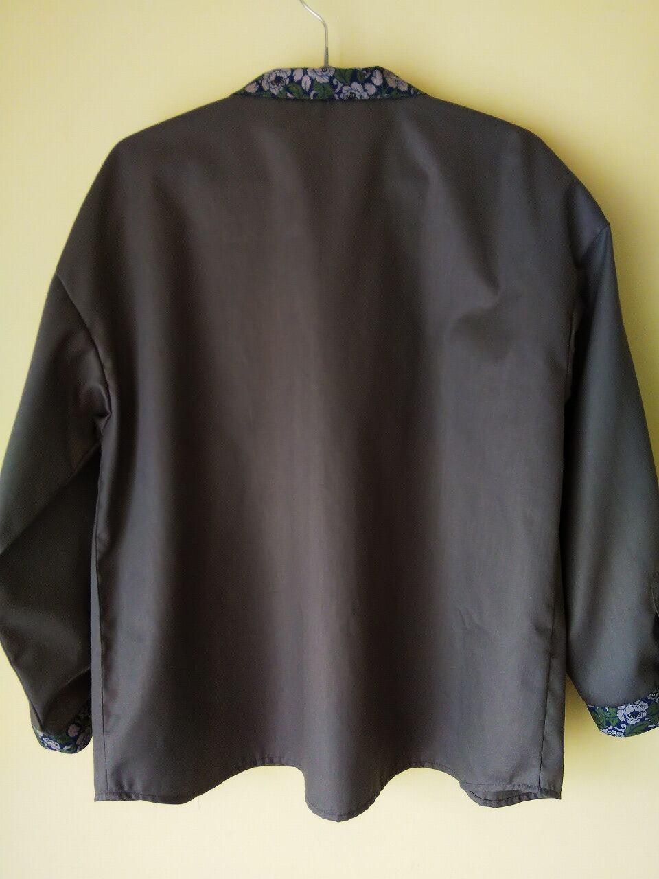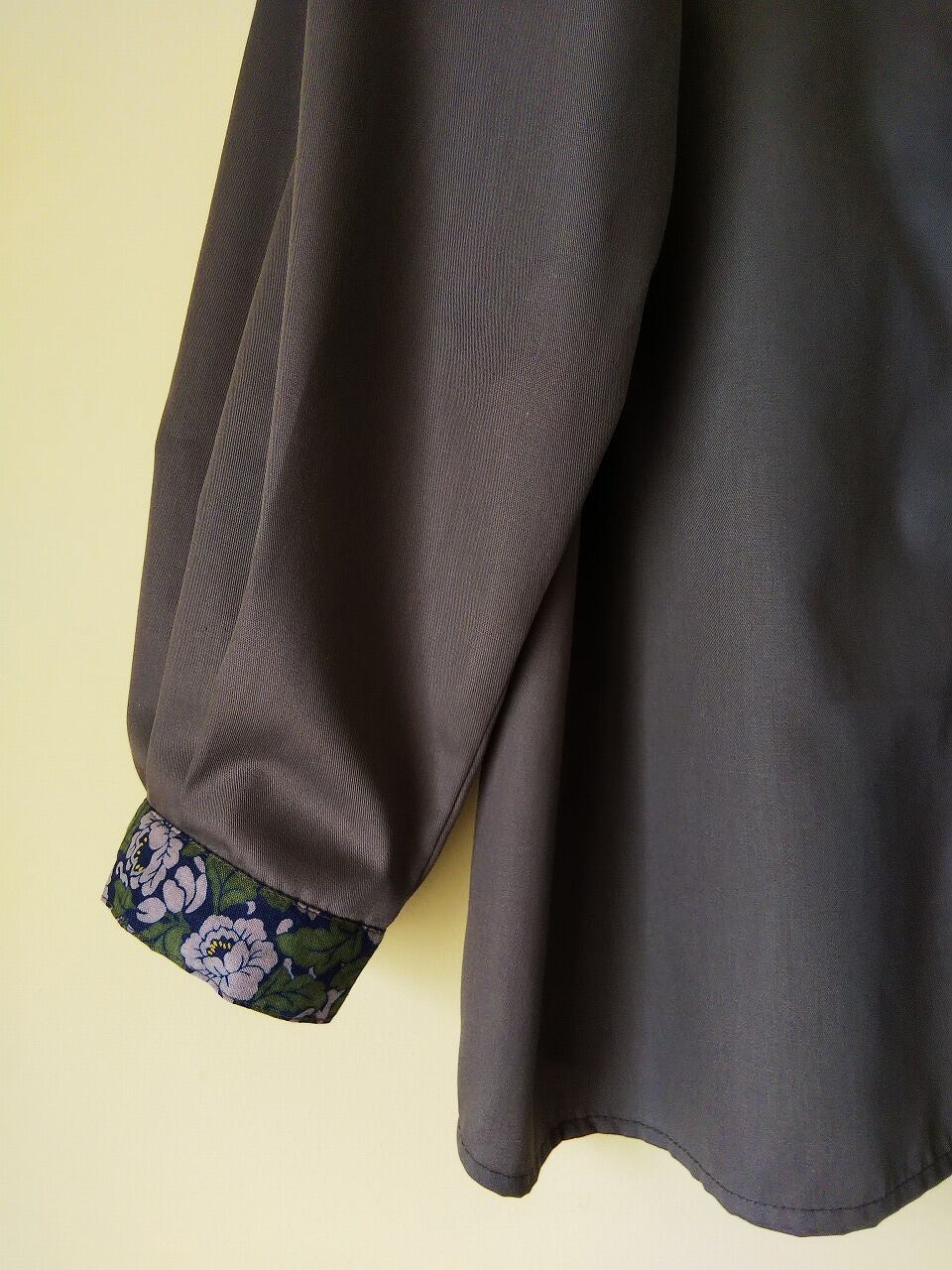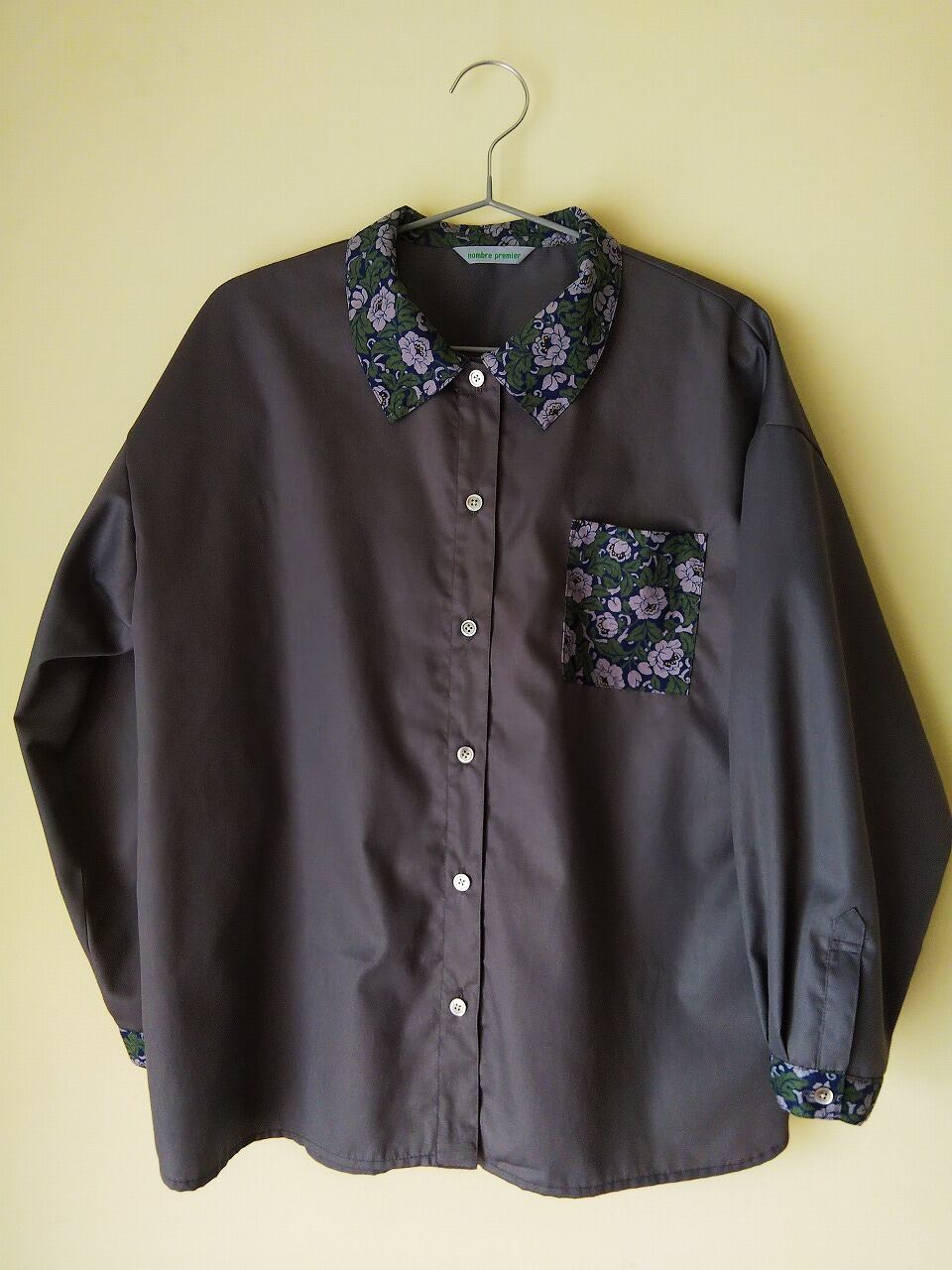 襟や袖口の花柄が上品な印象を与えるシャツです。