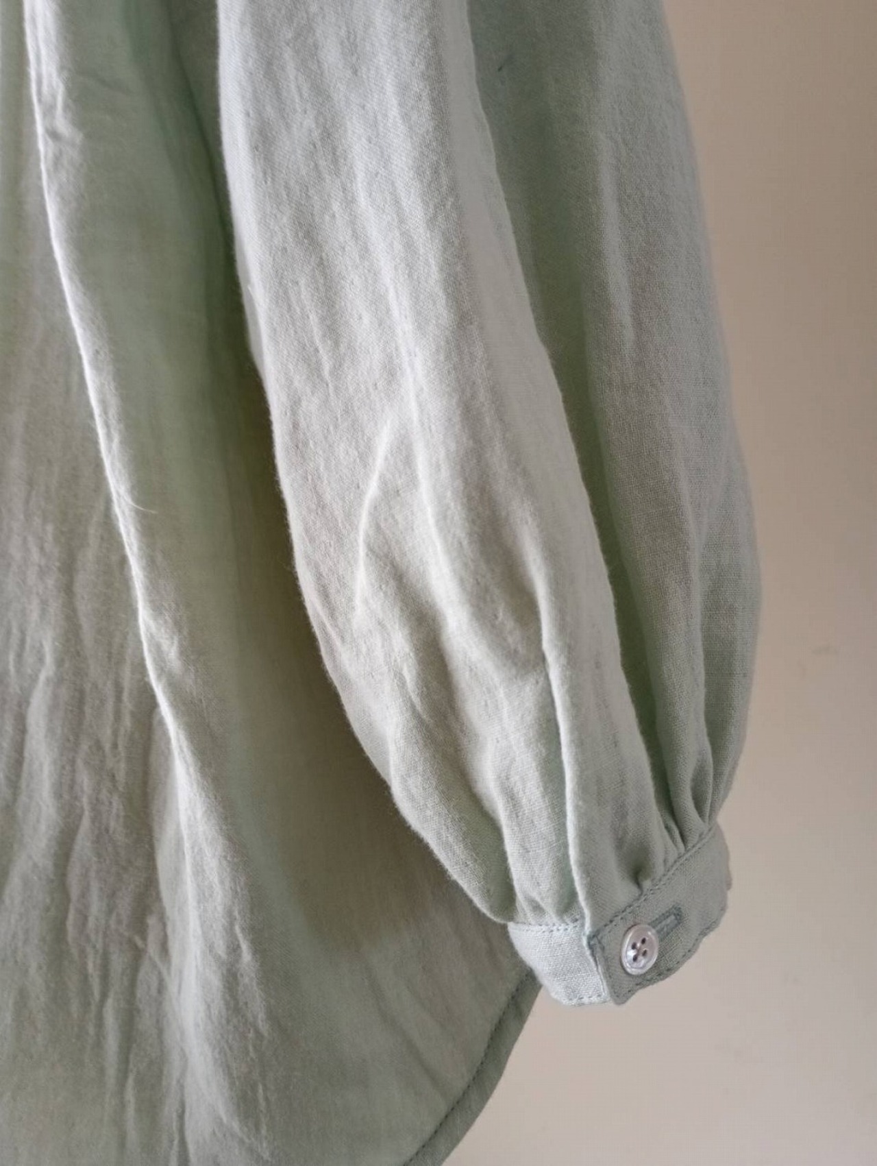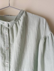 ボタンは貝ボタンを使用しています。照明によって表情を変えるので、さりげない個性を添えてくれます。